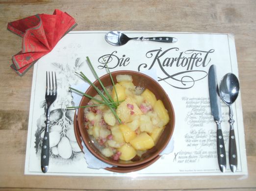 Apfel-Kartoffeln: Kartoffeln schälen, schneiden, als Salzkartoffeln mit 1/2 l Wasser kochen. Einen Apfel schälen und in Würfel schneiden. Den Apfel mit Zucker und wenig Wasser andünsten. Die abgegossenen Kartoffeln vorsichtig zu dem Apfel geben und mit Salz und etwas Weinessig abschmecken. Zuletzt wird noch 100 g ausgelassener Speck darüber gegeben und alles gut durchziehen lassen.