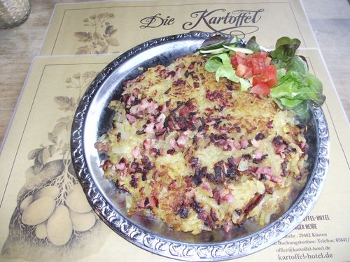 Kartoffeln waschen, gar kochen, abgießen, abdämpfen, heiß pellen, erkalten lassen. Auf einer großen Reibe grob reiben. Die Kartoffelmasse salzen und pfeffern. Den Speck von der Schwarte befreien und fein würfeln. Die Hälfte des Schmalzes in der Pfanne erhitzen und den Speck darin auslassen. Die Kartoffelraspeln über den Speck verteilen. Die Kartoffelmasse mit einem Spatel zu einem gleichmäßigen, flachen Kuchen formen. Das restliche Butterschmalz in die Pfanne geben und das Rösti bei reduzierter Hitze braten, bis die Unterseite eine goldgelbe Farbe angenommen hat. Das Rösti vom Rand lösen und auf einen Teller gleiten lassen. Mit Hilfe eines zweiten Tellers wenden, in die Pfanne zurückgleiten lassen und die andere Seite ebenfalls goldgelb braten. Das Rösti auf eine Platte stürzen und sofort servieren.