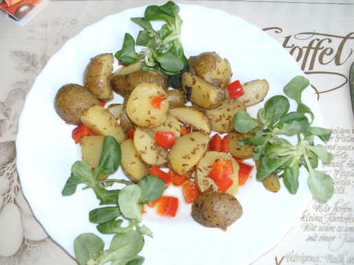Die Kartoffeln mit Hilfe einer kleinen Bürste unten kaltem Wasser gründlich reinigen und in reichlich Salzwasser nicht ganz gar kochen. Die Kartoffeln herausnehmen und ausdampfen lassen, aber nicht schälen. Die abgekühlten Kartoffeln vierteln. Knoblauch schälen, Chilis waschen, halbieren, Stilansätze und Kerne entfernen. Knoblauch und Chilis hacken. Paprikaschoten waschen, halbieren und putzen. Paprikahälften in Streifen schneiden. Olivenöl in einer Pfanne erhitzen und die Kartoffeln darin in etwa 10 Minuten knusprig anbraten. Die Parikastreifen zugeben und 10 Min. mitrösten. Den Knoblauch und die Chilis hinzufügen, 5 Min. mitbraten. Dann mit Salz, Pfeffer und Kreuzkümmel kräftig abschmecken. Kurz vor Ende der Garzeit die Kartoffeln mit dem Sherry-Essig beträufeln und die Flüssigkeit verdampfen lassen. Die Kartoffeln aus der Pfanne nehmen und noch heiß servieren.