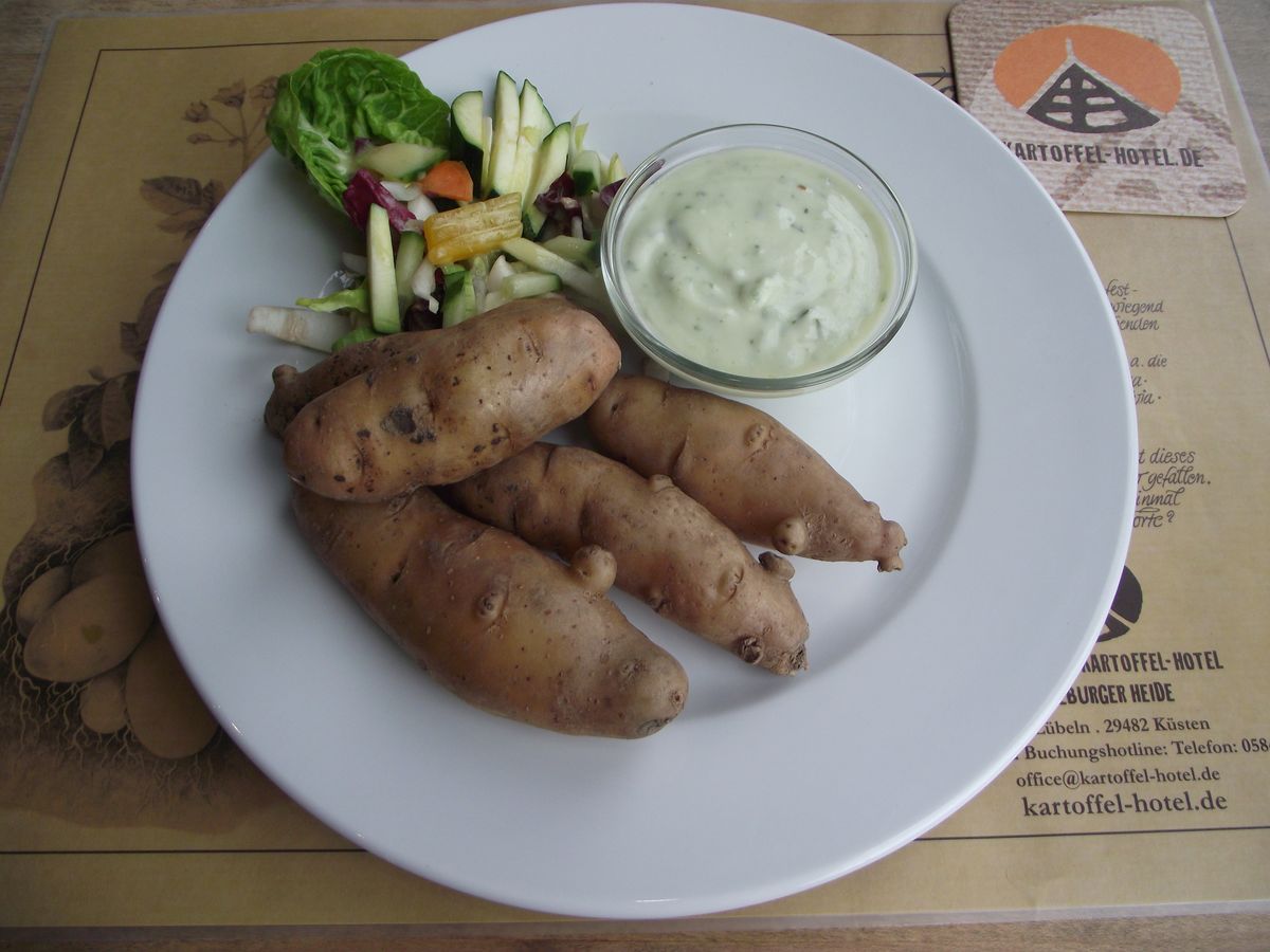 Bamberger Hörnchen waschen, und in Salzwasser garkochen. In der Zeit die Zitrone auspressen und in Schüssel geben. Den Johurt hinzufügen. Den Basilikum klein hacken und zusammen mit dem Zucker abschmecken.