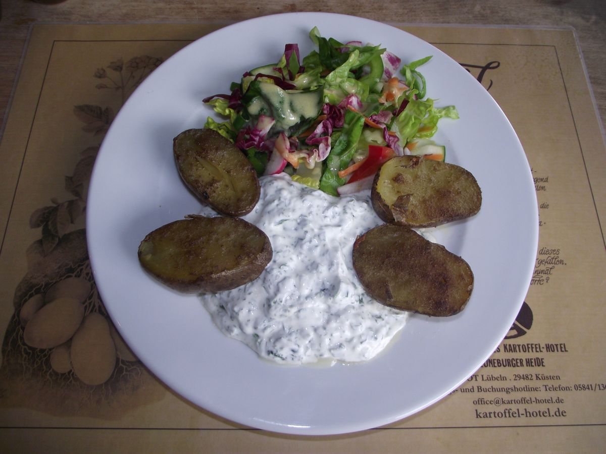 In der Zwischenzeit Quark mit Milch, gewürfelte Zwiebeln, Kräutern verrühren und zusammen mit den Kartoffeln anrichten.