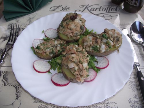 Den Backofen auf 200 °C vorheizen. Kartoffeln gründlich waschen, waagerecht halbieren und auf ein Backblech setzen. Kartoffeln mit Öl besteichen, mit Meersalz bestreuen. Im Ofen ca. 45 Minuten backen. Zwiebeln und Knoblauch schälen und würfeln. Petersilie waschen und hacken. Thunfisch abtropfen lassen, zerzupfen und mit 2 EL Öl pürieren. Kapern abtropfen lassen. Zwiebeln, Knoblauch, Kapern, Petersilie und Paniermehl unter das Püree rühren,salzen und pfeffern. Die Thunfischpaste nach ca. 30 Min. Backzeit auf die Kartoffelhälften verteilen und nocheinmal für 10 – 15 Minuten in den Backofen geben.