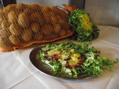 Den Bacon in Streifen schneiden und in einer Pfanne (ohne Fett) goldbraun ausbraten. Den Friseesalat waschen und trockenschleudern. Die restlichen Kartoffeln in dünne Scheiben schneiden und salzen. Den Schnittlauch in Röllchen schneiden. Friseesalat zerpflücken und auf einer Platte anrichten. Die Kartoffelscheiben und den Bacon darauf legen, die Kartoffel-Vinaigrette darüber verteilen und mit Schnittlauch bestreuen.