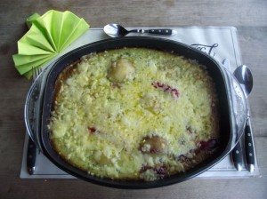Die gefüllten Kartoffeln, der Rest der ausgestochenen Kartoffeln und die restlichen Würstchen in eine entsprechend große, gefettete Auflaufform geben. Das Saucenpulver mit Sahne, Milch, Wasser und Gewürzen mit einem Schneebesen verrühren und über die Kartoffeln gießen. Alle Kartoffeln sollten nun mit Flüssigkeit bedeckt sein (die Form nicht zu klein wählen, denn die Brühe kocht hoch). Die Auflaufform mit geschlossenem Deckel in den vorgeheizten Backofen schieben und ca. 45 Minuten bei 180°C backen. Dann den Deckel entfernen, die Kartoffeln mit Käse bestreuen und weitere 15 Minuten backen.