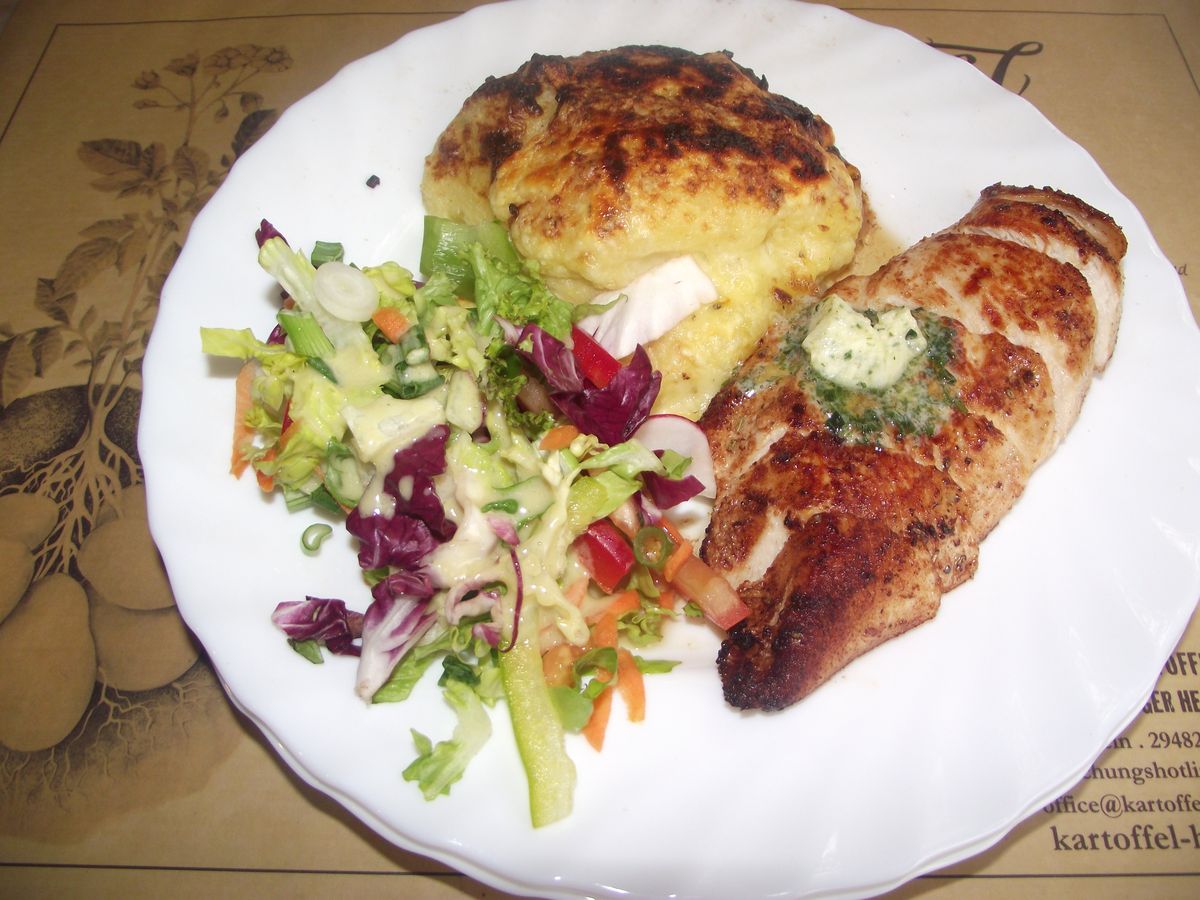 Die Kartoffeln schälen, waschen und in ausreichend gesalzenem Wasser in ca. 25 Min. garen. Durch eine Kartoffelpresse drücken oder mit dem Stampfer pürieren. In einen Topf geben. Auf den Herd stellen un unter ständigem Rühren bei schwacher Hitze Milch, 25 g Butter und Eigelb hinzufügen. Mit Salz, Muskat und Zucker abschmecken. Mit dem Schneebesen so lange schlagen, bis das Püree weiß und schaumig ist. Eine feuerfeste Form mit Butter oder Margarine einfetten. Etwas Püree in einen Spitzbeutel füllen. Das restliche Püree in die Form geben und glattstreichen. Mit dem Spritzbeutel einen Rand spitzen und das Ganze mit dem geriebenen Käse bestreuen. Die restliche Butter in Flöckchen darauf verteilen. Den Ofen auf 200 Grad vorheizen, die Form hineingeben und das Püree in ca. 15 Minuten überbacken. In der Zwischenzeit den Schnittlauch waschen, tockentupfen und in feine Ringe schneiden. Die Form aus dem Ofen nehmen und das Kartoffelpüree mit Schnittlauch bestreuen und sofort servieren. Dazu reichen wir gebratene Hähnchenbrust an Salat.