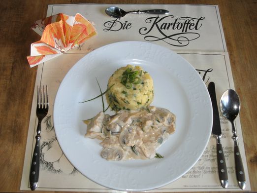 Kartoffeln schälen, waschen und vierteln. In Salzwasser ca. 20 Min kochen. Fleisch waschen, trocken tupfen und in Streifen schneiden. Lauchzwiebeln putzen, waschen und in Ringe schneiden. Champions putzen, evtl. waschen und in Scheiben schneiden. Öl in einer Pfanne erhitzen. Fleisch darin knusprig braten. Salzen, pfeffern und herausnehmen. Pilze im Bratfett anbraten, dann herausnehmen. 2 EL Butter im Bratfett erhitzen. Mehl darin anschwitzen. Sahne, 300 ml Wasser, Wein und Brühe einrühren, aufkochen lassen. Fleisch, Pilze und Lauchzwiebeln, bis auf einige, zugeben. Ca. 5 Minuten köcheln lassen. Senf unterrühren. Mit Salz und Pfeffer würzen. Kartoffeln abtropfen lassen. Mit Milch und 2 EL Butter zu Püree stampfen. Kräuter waschen. Petersilie abzupfen und hacken. Schnittlauch in Röllchen schneiden. Mit Salz und Muskat würzen. Alles anrichten. Mit übrigen Lauchzwiebeln bestreuen.