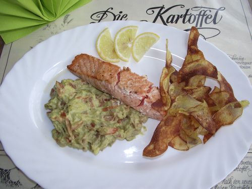 Lachsfilets mit Kartoffelchips und Avocadocreme