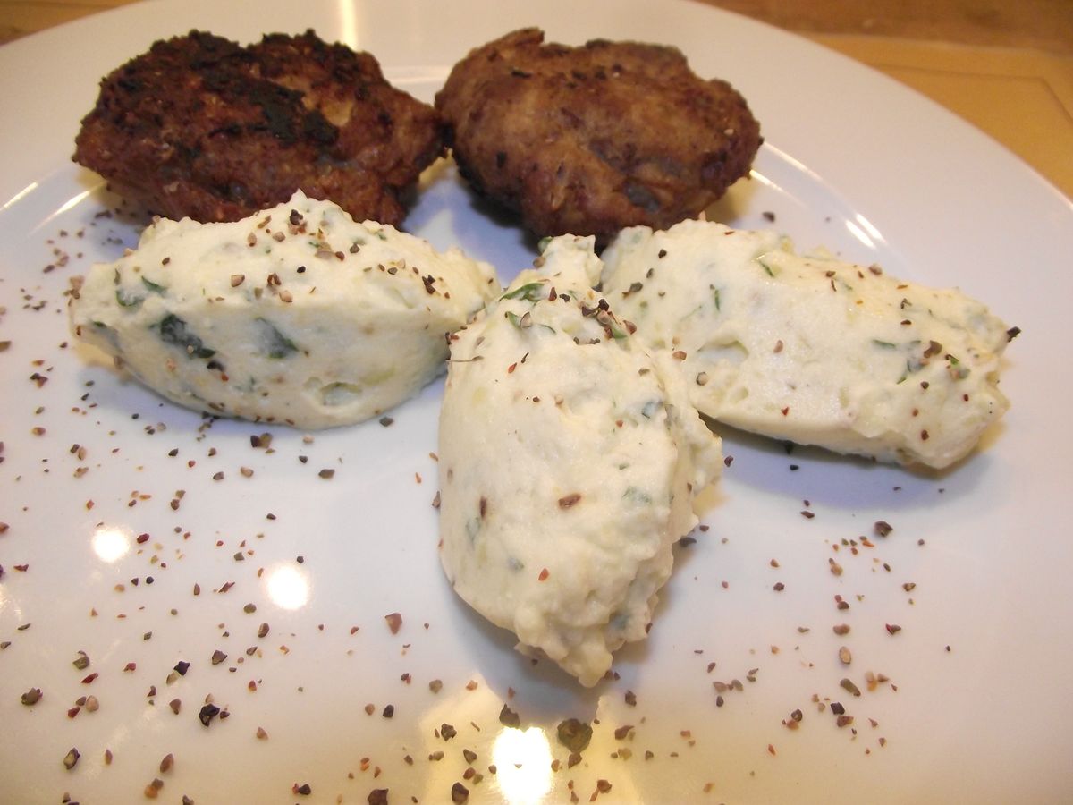 Kartoffeln waschen und gar kochen, gut abdampfen lassen, pellen, sofort durch eine Kartoffelpresse drücken und abkühlen lassen. Die Zwiebeln schälen und in feine Würfel schneiden . Saure Sahne mit einem kochlöffel unterrühren und so viel süße Sahne dazugießen bis es eine weiche geschmeidige Creme entsteht. Mit Salz und Pfeffer würzig abschmecken und mit feingeschnittenem Schnittlauch bestreuen. Dazu Servieren Sie am besten Kartoffelbrot oder Frikadellen.