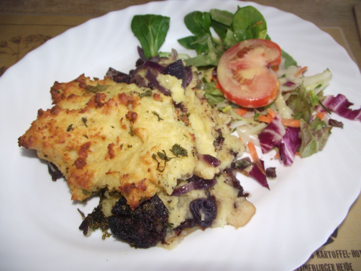 Die Kartoffeln schälen, waschen und würfeln. Mit Salzwasser bedeckt zum Kochen bringen in in ca. 12 bis 15 Minuten garen. Die Kartoffeln abgießen und abdämpfen. Mit der Milch pürieren. Mit Salz, Pfeffer und Muskatnuss würzen. Die Zwiebeln schälen und in Scheiben schneiden. Das Öl in einer Pfanne erhitzen und die Zwiebeln darin glasig braten. Die Blutwurst häuten und in Scheiben schneiden. Zu den Zwiebeln geben und ca. 5 Minuten schmoren lassen. Mit Salz und Pfeffer würzen. Die gehackten Majoranblätter untermischen. Die Blutwurst- und Zwiebelscheiben aus dem Fett nehemen und dabei abtropfen lassen. Das Fett beiseite stellen. Die Äpfel schälen, vierteln, das Kerngehäuse entfernen und in dünne Scheiben schneiden. Eine feuerfeste Form ausfetten, die Hälfte des Kartoffelpürees hineingeben. Etwas von der gehackten Petersilie darüber streuen. Die Hälfte der Blutwurst- und Zwiebelscheiben, dann die Apfelscheiben einschichten. Die restlichen Blutwurst- und Zwiebelscheiben darübergeben und mit dem restlichen Kartoffelpüree bedecken. Die Petersilie darüber streuen. Den Auflauf mit dem verbliebenen B´ratfett begießen. Den Backofen auf 200 Grad vorheizen und in ca. 30 Minuten goldbraun backen.
