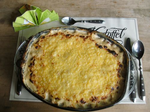 Abschließend den geriebenen Emmentaler darüberstreuen und im vorgeheizten Backofen bei 200 Grad ca. 20 Minuten backen.
