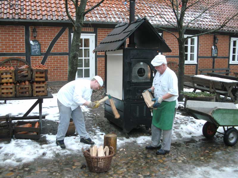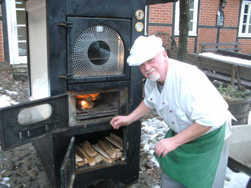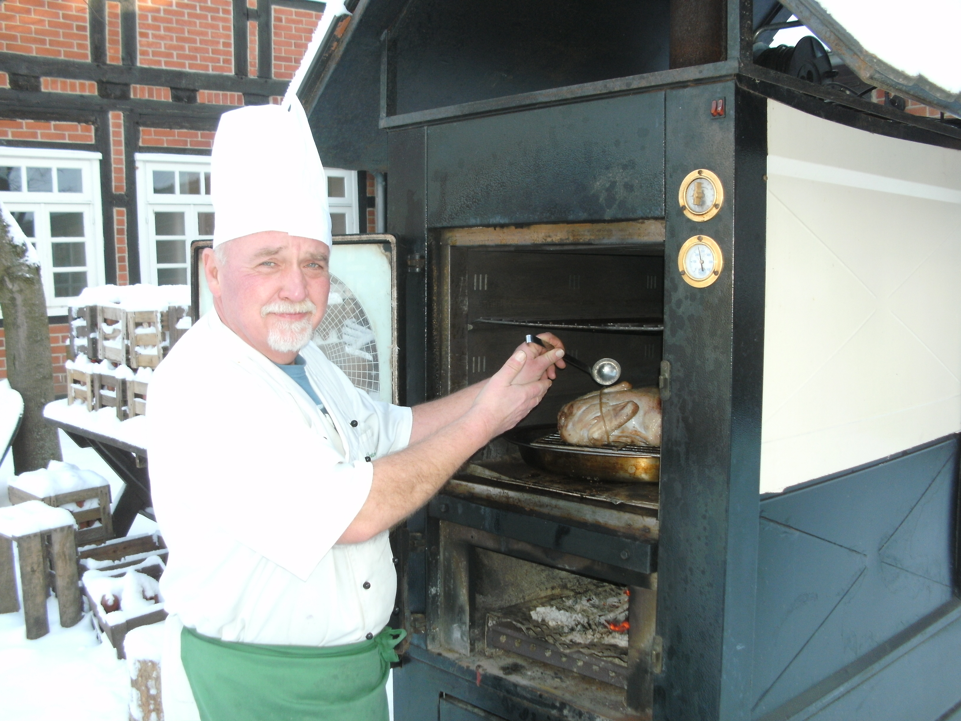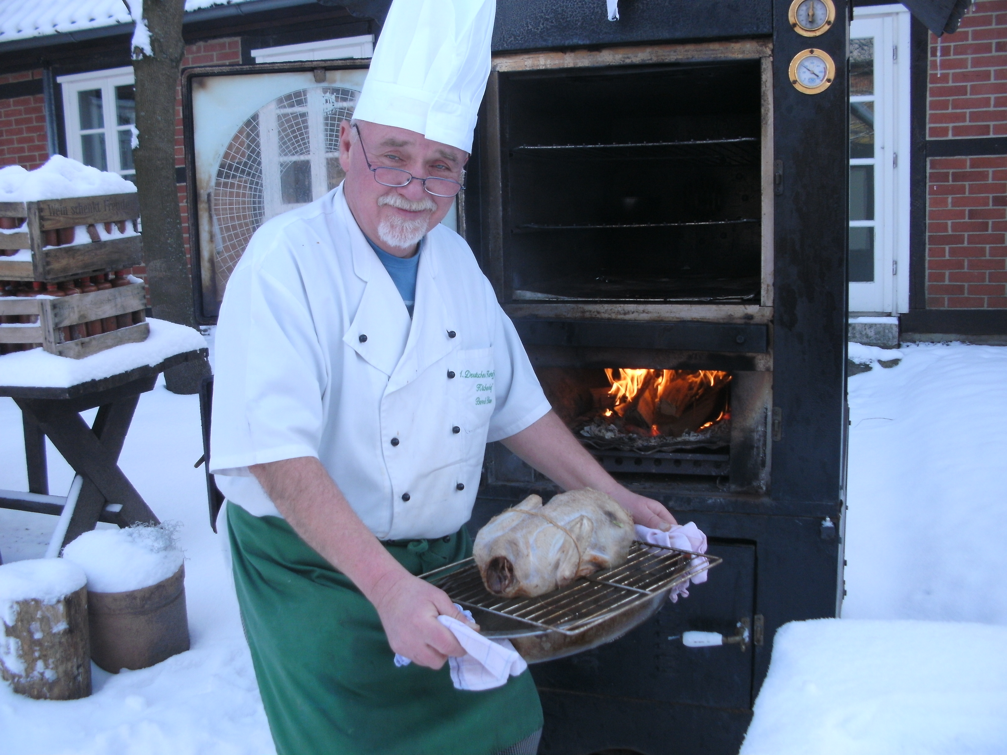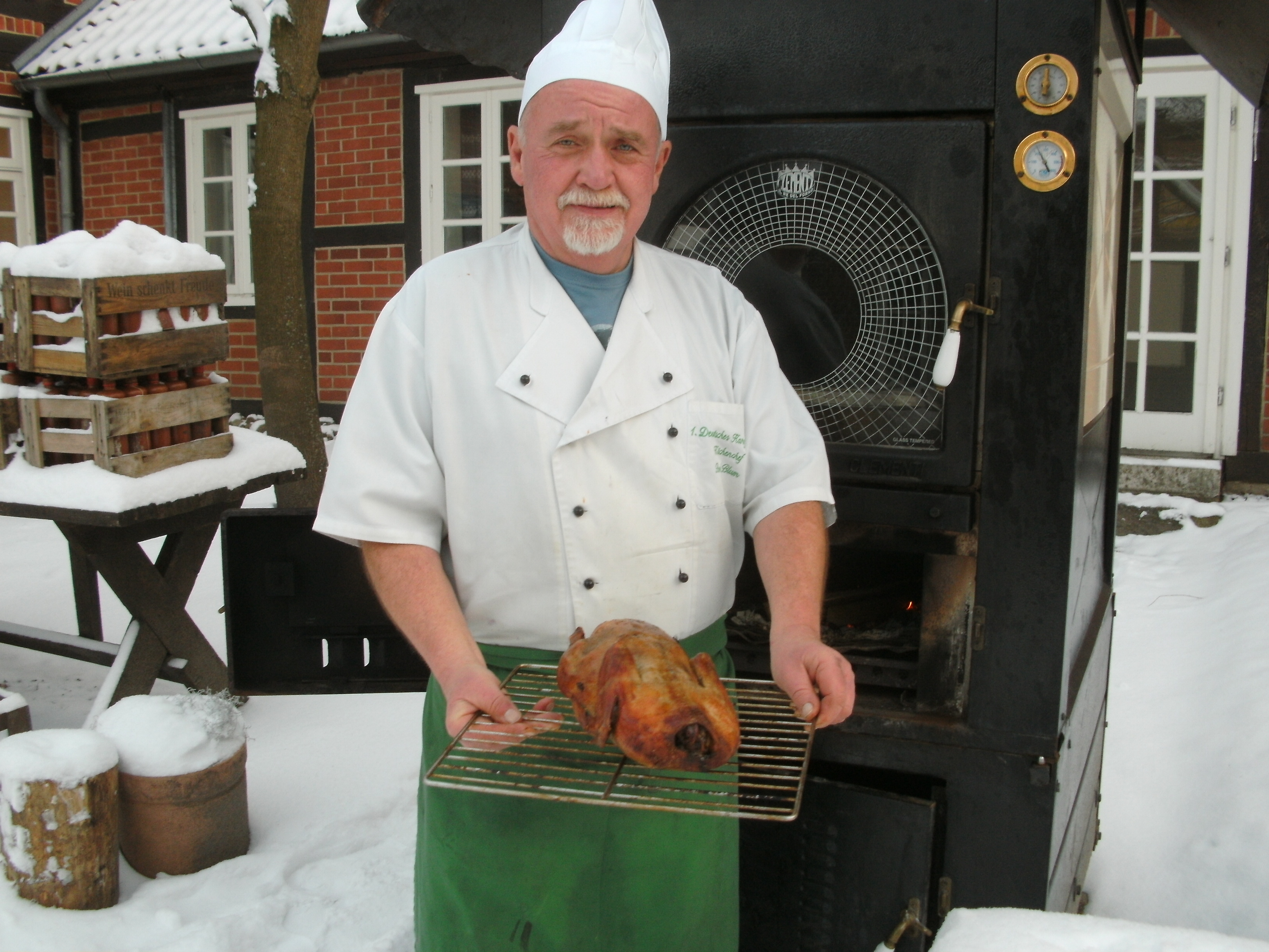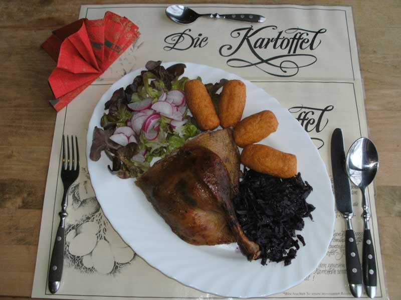 Den Beutel mit den Innereien aus der Ente nehmen. Die Ente unter fließendem Wasser innen und außen abspülen, dabei evtl. vorhandene Federkiele entfernen. Von innen und außen mit Salz und Pfeffer einreiben. Für die Füllung: Die Brötchen würfeln, und in einer Pfanne ohne Fett leicht rösten. Die heiße Milch darüber gießen, die Pfanne von der Herdplatte nehmen und die Würfel 5 Minuten quellen lassen. Speck fein würfeln und bei mittlerer Hitze ausbraten. Zwiebeln abziehen, würfeln, zugeben und kurz mitbraten. Die Äpfel abspülen, vierteln, das Kerngehäuse entfernen und die Apfelviertel in Spalten schneiden. Äpfel, heiß abgespülte Rosinen, Walnüsse, Brötchenwürfel, Speck-Zwiebel-Mischung und abgezupfte Majoranblättchen vermischen. Mit Salz und Pfeffer kräftig abschmecken. Die Ente aufrecht mit der Bauchöffnung nach oben in eine hohe Schüssel stellen. Füllung in die Ente geben und die Bauchöffnung mit kleinen Holzspießen zustecken und mit Küchengarn verschnüren.Beine und Flügel mit Garn an den Körper binden, damit sie nicht verbrennen. Ente mit dem Rücken nach unten auf den Rost des Backofens legen und den Rost auf eine mit Wasser ausgespülte Fettpfanne setzen. Auf eine untere Schiene des auf 200 Grad (Umluft 180 Grad, Gas Stufe 4) vorgeheizten Backofens ca. 3 Stunden braten. Zwichendurch etwas einpieksen, damit das Fett ausbraten kann. Immer mal wieder das Bratfett über die Ente gießen. Nach 1 1/2 Stunden (nach Belieben) die Innereien dazugeben.