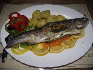 Möhren, Sellerie und Porree in feine Würfel schneiden. Ein grösseres Stück Alu-Folie vorbereiten, das Gemüse darauf geben. Die Forelle salzen, mit Kräuterbutter und Zitronenvierteln füllen. Die Petersilie grob zupfen und auf der Forelle verteilen. Die Folie fest verschliessen, auf ein Backblech o.Ä. legen und im vorgeheizten Backofen 20 bis 25 Minuten garen.