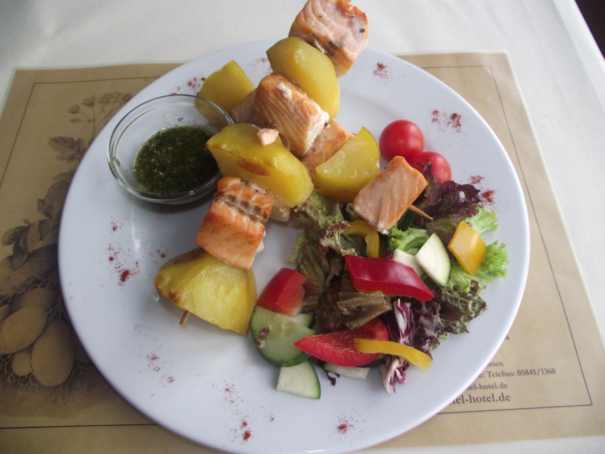 Lachsfilet abbrausen, trocken tupfen, in 16 Stücke schneiden. Zitrone heiss waschen und trocken reiben. 1 TL der Schale abreiben, den Saft auspressen. Lachs mit 1 – 2 EL Zitronensaft marinieren. Rucola abbrausen, trocken schütteln. Die harten Stiele entfernen, den Rest grob hacken. Käse reiben. Beides mit 5 EL Olivenöl, Brühe, Zitronenschale, übrigem Zitronensaft, Salz und Pfeffer pürieren. Kartoffeln pellen und nach Bedarf halbieren, Spiesse einölen. Kartoffeln abwechselnd mit den Fischwürfeln daraufstecken. Restliches Öl (2 EL) in einer beschichteten Pfanne erhitzen. Die Spiesse salzen, pfeffern und in heissem Öl rundum goldbraun braten. Spiesse auf dem Teller anrichten, mit Rucola-Pesto beträufeln oder seperat reichen.