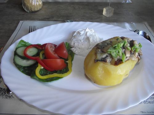 Die Kartoffeln schälen und aushöhlen. Das Innere aufbewahren. Die Zwiebeln schälen. Zusammen mit dem Schinken fein hacken. Die Champignons putzen und blättrig schneiden. Diese drei Zutaten in heissem Öl anbraten. Für die Füllung werden die Gewürzgurken und das ausgehöhlte Innere klein gehackt. Mit den Gewürzen, dem Ei und den angebratenen Zutaten vermengen und in die Kartoffelhälften füllen. Die Kartoffeln nun jeweils in Alufolie wickeln. Im vorgeheizten Backofen bei 200 Grad ca. 20. Minuten backen.