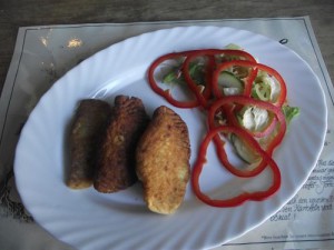 Kartoffeln waschen, mit der Schale kochen. Noch heiss pellen und durch die Kartoffelpresse drücken. Kartoffelmasse mit 2 Eigelb, Butter, Griess und Mehl verkneten, mit Salz, Pfeffer und Muskat würzen. Teig zugedeckt etwa 15 Minuten ruhen lassen. Rucola waschen, trocken schütteln und die dicken Stiele entfernen. Blätter grob hacken. Schichtkäse mit übrigen Eigelben und Rucola verrühren und würzen. Kartoffelteig auf bemehlter Fläche dünn ausrollen, Kreise mit gut 10 cm Durchmesser ausstechen. Übrigen Teig verkneten und erneut ausstechen. Ränder mit verquirlten Eiweiss bestreichen. Je einen EL Füllung auf eine Hälfte von jedem Plätzchen geben. Die andere Hälfte darüberschlagen und festdrücken. In einer Pfanne Öl erhitzen und die Kartoffeltaschen darin goldgelb backen. Gut abtropfen lassen und mit Mandelbutter beträufeln (etwas Butter schmelzen, Mandelblättchen darin goldbraun rösten).