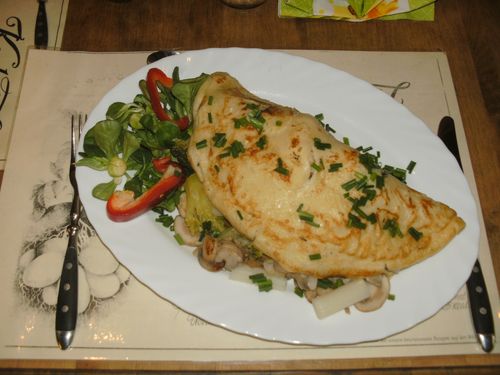 Mehl in eine Schüssel geben. Milch, Eier, Salz, Pfeffer, Knoblauchzehe und Kräuter gut verquirlen. In die Mitte des Mehls eine kleine Grube drücken und von dort aus die Flüssigkeit mit dem Mehl zu einem dickflüssigen Teig verrühren. Den Teig 20 Minuten ruhen lassen. Frischen Spargel waschen, schälen, in Stücke schneiden und in Salzwasser ca. 10 Minuten bissfest garen. Champignons waschen und in Scheiben schneiden. Butter in einer Pfanne erhitzen. Alle Gemüse und Gewürze hineingeben und bei geringer Hitze schmoren lassen. Mehrmals wenden. Butter oder Fett in einer Pfanne erhitzen. Mit einem Schöpflöffel etwas Teig in die Pfanne giessen. Die Pfanne drehen, bis sich der Teig über dem Boden verteilt hat. Pfannkuchen von beiden Seiten goldgelb backen. Gemüse auf den Pfannkuchen verteilen, anschliessend umschlagen und mit frischen Kräutern (z.B. Kresse) bestreuen. Die fertigen Pfannkuchen im Backofen bei ca. 100 Grad warm stellen.