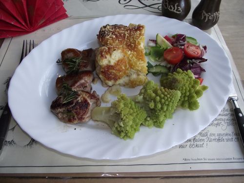 Kartoffeln, schälen, waschen, in dünne Scheiben hobeln. 4 Gratinförmchen (ca. 200 ml) mit etwas Trüffelbutter einfetten. Kartoffeln dachziegelartig einschichten, mit Salz und Pfeffer würzen. Sahne erwärmen, übrige Trüffelbutter darin schmelzen. Über die Kartoffeln giessen. Im vorgeheizten Backofen (200 Grad Umluft) ca. 45 Minuten goldbraun backen. Romanesco in kochendem Salzwasser ca. 15 Minuten garen. Rosmarin waschen und trockenschütteln. Die Steaks trocken tupfen, je ein Zweig Rosmarin darumbinden. Steaks in zwei Esslöffel heissen Butterschmalz pro Seite ca. 3 Minuten braten. Mit Salz und Pfeffer würzen, warm stellen. Bratensatz mit Balsamico ablöschen. Alles auf einem Teller anrichten.
