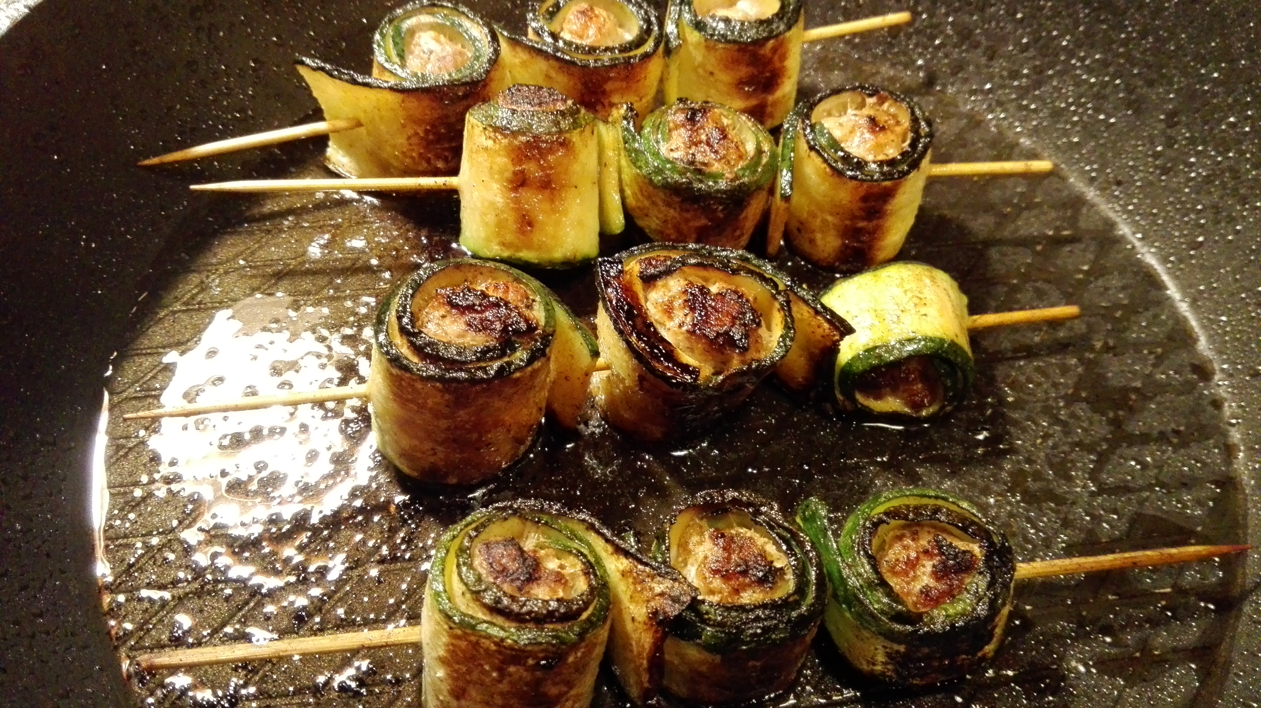 Aus dem Hackfleisch kleine Bällchen formen und mit der Zucchini abwechselnd auf ein Spieß stechen.