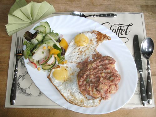 Die Kartoffeln schälen, mit Salzwasser aufsetzen und gar kochen. Anschließend die Kartoffeln feinstampfen, die gehackte Zwiebel, das Corned Beef und eine bis zwei gewürfelte Gurken untermischen. Gurkensaft nach Geschmack zugeben. Mit Pfeffer, Muskatnuss und ein Stückchen Margarine abschmecken. Dazu servieren wir Spiegeleier.
