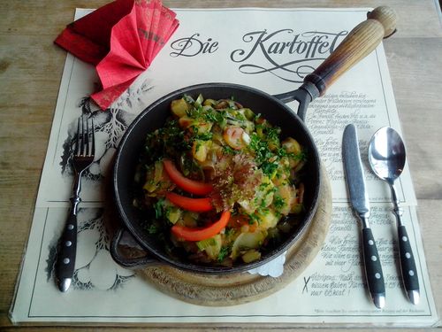 Den Lauch waschen, putzen und in feine Ringe schneiden. Die Zwiebel abziehen und fein hacken. Die Kartoffeln schälen, waschen und in schmale Scheiben schneiden oder hobeln. Den Speck in einer heißen Pfanne auslassen und die Kartoffeln zugeben. Unter gelegentlichem Wenden ca. 10 Minuten goldbraun braten. Die Zwiebel und die Lauchstreifen zugeben, unterschwenken und weitere 3-4 Minuten mitbraten. Mit Salz, Pfeffer und Kümmel abschmecken und mit frisch gehackter Petersilie bestreuen.