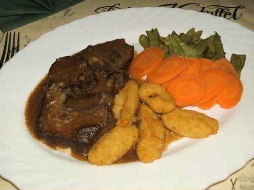 Das Fleisch herausnehmen und im ausgeschalteten Backofen ziehen lassen. Inzwischen die Sauce ohne das Lorbeerblatt pürieren, etwas einkochen und abschmecken.