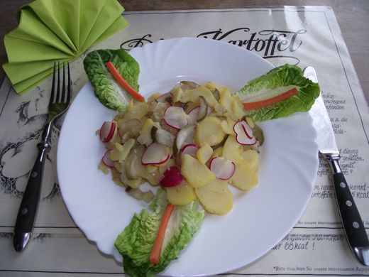 Kartoffeln als Pellkartoffeln (mit Schale) 25 Minuten kochen, abgiessen und abschrecken. Die Kartoffeln pellen und in Scheiben schneiden. Die Schüssel mit der halbierten Knoblauchzehe ausreiben. Kartoffelscheiben hineingeben. Zwiebel schälen und fein hacken. Brühe mit den Zwiebeln erhitzen, kurz abkühlen lassen, mit dem Essig über die Kartoffelscheiben giessen. Gurken abtropfen lassen und in Stifte schneiden. Radieschen waschen, putzen und in dünne Scheiben schneiden. Mit den Gurken und Öl unter den Kartoffelsalat heben, mit Salz und Pfeffer kräftig würzen. Den Salat bei Zimmertemperatur mindestens 15 Minuten ziehen lassen.