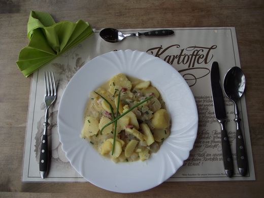 Die Kartoffeln in der Schale kochen, pellen und in Scheiben schneiden. Den Speck und die Zwiebeln fein würfeln, im Öl goldbraun braten, mit Brühe und Essig ablöschen. Das Eigelb unterrühren, nicht aufkochen lassen. Die Kartoffeln vorsichtig mit der Sauce mischen. Abgetropfte Gurken (Gurkensud aufbewahren) würfeln. Den Schnittlauch in Röllchen schneiden. Beides unter den Salat mischen. Den Salat 30 Minuten durchziehen lassen, dann mit Salz und Pfeffer würzen und 5 – 8 Esslöffel Senfgurkensud unterrühren.