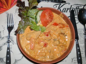 Feuertopf: Schnitzelfleisch in Streifen schneiden (oder Gulasch halb/halb) in einem Topf mit etwas Öl gut anbraten (Gulasch fertig garen). Mit Steakgewürz, Cayennepfeffer, Curry, Rosenpaprika und Salz würzen. Zwiebeln und Paprika in Würfel schneiden und hinzufügen. Peperoni (nach Bedarf/Geschmack) sehr fein hacken und dazugeben. Champignons blättrig schneiden, ebenfalls zufügen. Mit Ketchup und Chilisauce auffüllen, ca. 10 Minuten köcheln lassen. Silberzwiebeln abgiessen, Gewürzgurken in Würfel schneiden, Ananas abgiessen, klein schneiden und alles zum Feuertopf geben. 10 bis 15 Minuten köcheln lassen. Zum Schluss saure Sahne und Weisswein hinzufügen und abschmecken.