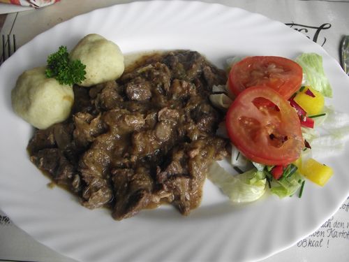 Das Fleisch in große Würfel schneiden und mit den Zwiebeln in Schweineschmalz von allen Seiten scharf anbraten. Mit Bier ablöschen und die Gewürze dazugeben, mit den Semmelbröseln binden. Das Sauerkraut darüberlegen und das Ganze ca. 1,5 Stunden schmoren lassen. Dazu reichen wir Kartoffelklöße.