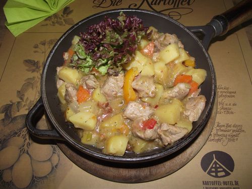 Fleisch in der Butter anbraten, Kartoffeln und Zwiebeln zugeben und unter Rühren weiter braten. Sauerkraut und Brühe zugießen. Pikant mit Salz, Pfeffer und Paprika abschmecken und zugedeckt ca. 10 -15 min schmoren. Für die würzigere Variante noch etwas Kümmel, Lorbeerblätter und eine zerkleinerte entkernte Chilischote zugeben.