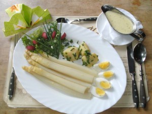 Spargel waschen, schälen und ggf. bündeln. Spargel in das kochende Wasser geben, dem Salz und Zucker und wenig Butter oder Öl zugegeben wurde. Spargel – je nach Wunsch – ca. 15-25 Minuten kochen lassen. Anschließend den fertigen Spargel vorsichtig mit einem Schaumlöffel aus dem Wasser heben und auf einer vorgeheizten Servierplatte anrichten. Die Zwiebel wird in Scheiben geschnitten, der Schinken in Würfel. Dann dämpft man beides in der zerlassenen Butter hellgelb, gibt das Mehl darüber und lässt es anziehen. Anschließend mit Brühe und Milch löschen, Käse und Gewürze hinzugeben und langsam durchkochen lassen. Die Sauce nun durch ein Sieb ziehen. Den Rückstand im Sieb kann für Fleischspeisen oder Suppen verwendet werden. Dazu passt: Schinken oder Schnitzel, Kartoffeln, Rührei oder in Viertel geschnittene hartgekochte Eier.