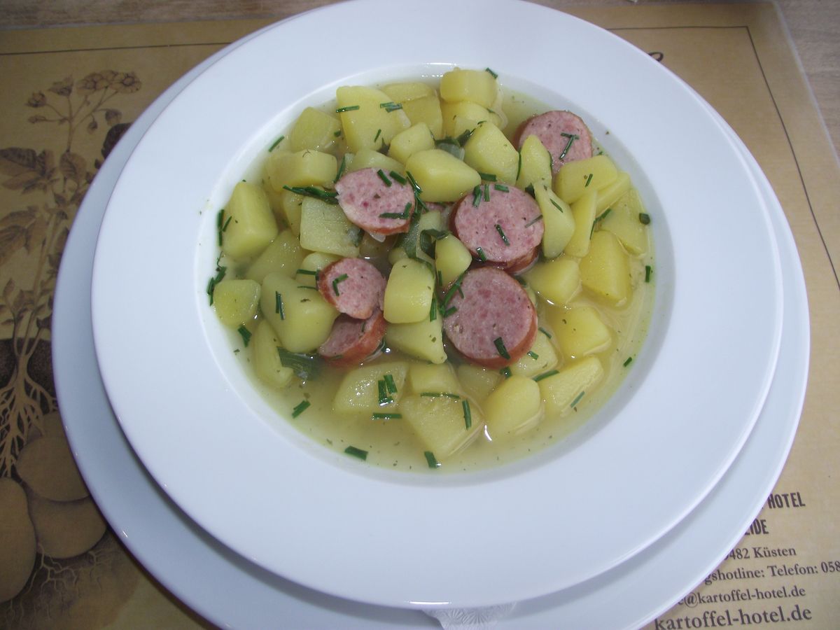 Inzwischen die Kartoffeln schälen, waschen, in kleine Würfel schneiden und nach 20 Minuten in die Fleischbrühe geben. Weitere 20 bis 30 Minuten köcheln, bis die Kartoffeln gar sind. Die Debreziner in Scheiben schneiden und während der letzten 5 Minuten in die Suppe geben. Den Schnittlauch waschen und in Röllchen schneiden. Die Suppe mit Salz, Pfeffer und Majoran abschmecken, die Schnittlauchröllchen in die Suppe streuen und heiss servieren.