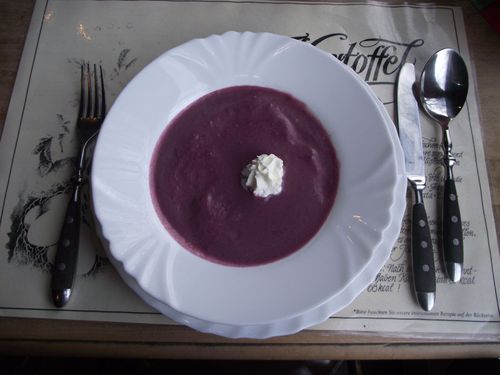 Butter in einer Pfanne erhitzen, Zwiebeln beigeben und etwas andünsten, Äpfel zugeben und weiter dünsten, dann das Blaukraut zugeben mit Salz etwas würzen und gut dünsten. Die Marmelade zugeben, weiter dünsten. Dann das Mehl zufügen, alles gut durchmischen und leicht anrösten, unter Rühren mit der kalten Gemüsebrühe ablöschen. Das Ganze dann halb zugedeckt bei schwacher Hitze kochen lassen (ca. 45 Minuten). Sahne und Eigelb miteinander verrühren, der Suppe beigeben. Alles mit dem Pürierstab pürieren. Mit Salz, Pfeffer und etwas Zimt abschmecken. Beim Anrichten mit Sahnehäubchen verzieren und sofort servieren.