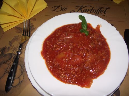 Kartoffeln schälen und in Scheiben schneiden. In erhitztem Fett kleingeschnittene Zwiebel und das Gehackte anbraten, die Kartoffeln und die heisse Brühe zugeben. 25 Minuten dünsten lassen, abschmecken und das Gericht mit kleingehackten Kräutern bestreuen. Nach Belieben können dem Hackfleisch 2 EL Tomatenmark oder getrocknete Pilze zugefügt werden.