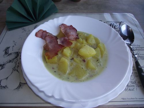 Die Kartoffeln in cm grosse Würfel schneiden. Zwiebeln und Speck in kleinere Würfel schneiden. Das Öl erhitzen und darin den Speck anrösten, Zwiebeln dazugeben und glasig werden lassen. Das Mehl unterrühren, kurz anschwitzen dann die Brühe zugiessen und glattrühren. Majoran und Knoblauch dazugeben und ca. 10 Minuten kochen lassen. Die Erdäpfel untermengen und kochen, bis sie kernig weich sind. Glattgerührten Sauerrahm einrühren und mit Salz und Pfeffer abschmecken. Mit „Speckchip“ garniert servieren.