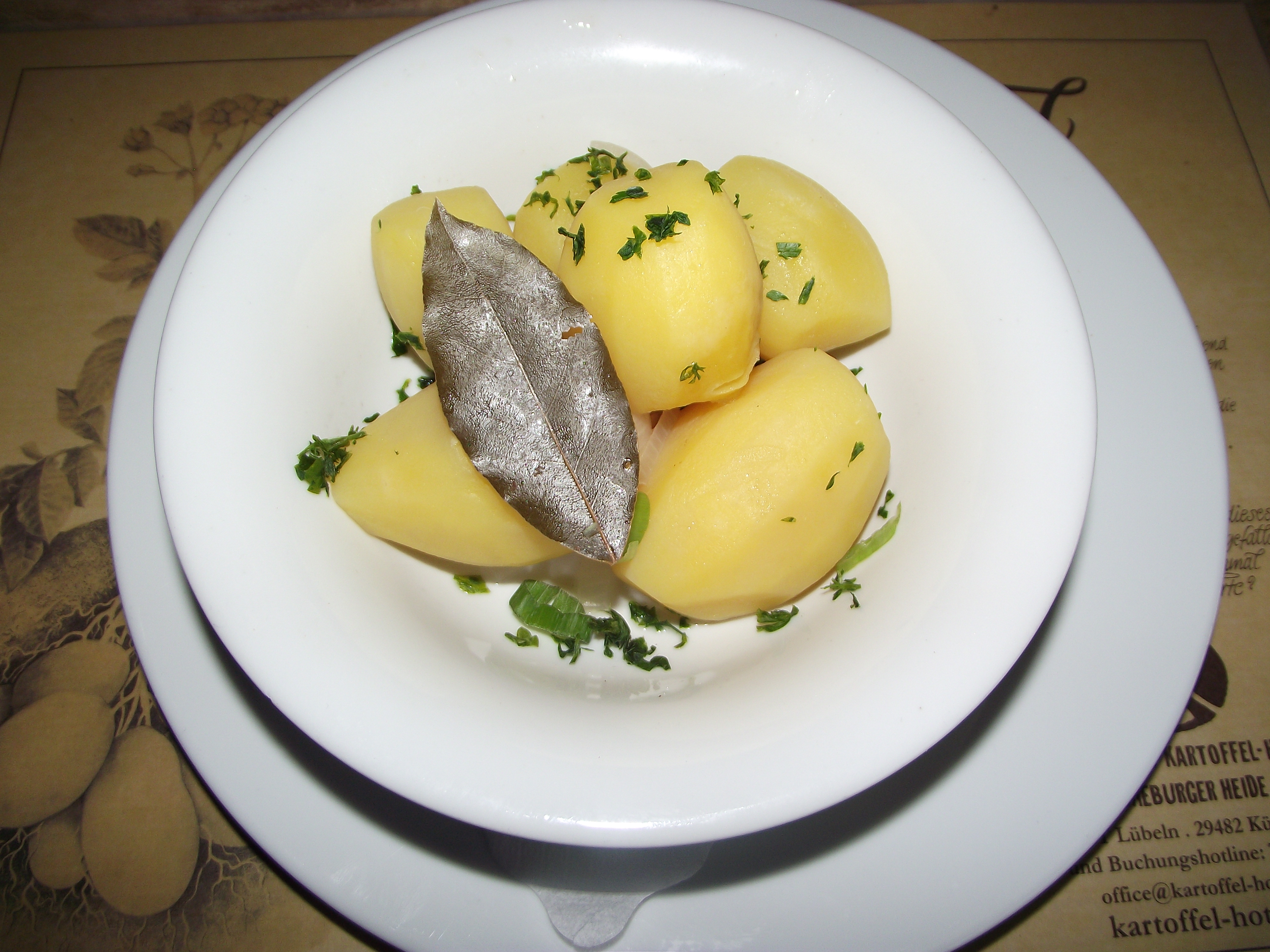 Rohe, mittelgroße Kartoffeln werden geschält, gewaschen, mit siedendem Wasser übergossen, auf ein Sieb geschüttet und nachdem sie abgetropft sind, in eine Kasserolle getan.Ein Esslöffel frische Butter oder gutes Bratenfett, eine geschälte Zwiebel, 1-2 Lorbeerblätter und 5-6 Pfefferkörner dazu geben. Dann wird so viel kaltes Wasser darauf gegossen, dass die Kartoffeln nur gerade bedeckt sind. Nun kocht man sie auf mäßiger Hitze so lange, bis sie auseinander fallen, aber nicht zu Brei werden. Etwas Essig dazu gießen. Dann schüttelt man sie leicht und gibt sie recht heiß zu Tisch.