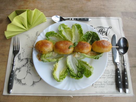 Die Kartoffeln schälen und unzerteilt gar kochen, danach abgießen. Den Mozzarella abtropfen lassen und in 12 dünne Scheiben schneiden. Die Kartoffeln in eine Pfanne mit etwas Öl geben und rundherum anbraten, danach auf jede Kartoffel eine Scheibe Mozzarella legen, mit Salz, Pfeffer und Paprika würzen, zudecken und den Mozzarella kurz anschmelzen lassen.